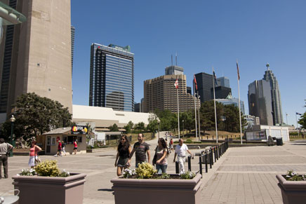 Rogers Centre Station is located at Bremner and Lower Simcoe. It does not connect with any TTC surface routes, but is such an important station, the lack of connections is not important. It serves both a high density of residents and businesses as well as important landmarks, leading to potentially high uses at all hours of the day. Rogers Centre Station is an important station to serve Rogers Centre and the Air Canada Centre for sporting events and concerts, The Metro Toronto Convention Centre for numerous conventions throughout the year, and the CN Tower for tourists. Even though its location best lends itself to times when events are actually happening nearby, , Rogers Centre also has seen a tremendous amount of development in the last few years, including several projects currently under construction or in planning stages. Infinity Condos and the Telus Building were constructed in 2006. Infinity Condos and the Telus Building have already been constructed since 2006, and many other buildings including Maple Leaf Square, Ice Condos, The Ritz-Carlton, and 18 York St. are under construction or planned, a number of which are taller than 40 stories. As a result of this, density by 2014 is expected to be 55% greater than levels measured in the 2006 census and Transportation Tomorrow Survey, bringing the density levels on par with St. Lawrence station and Bay Station. Unfortunately, much of the land that is available is already planned for development and included in density calculations, so not much further infill would be possible. There are some parking lots around York St. between the Gardiner and Harbour St. that may eventually be developed, and though doubtful, it is possible that the railway tracks get built over as has been done in numerous other cities. Before this can happen, electrification of the tracks would have to occur. Due to the high levels of density that would make it amongst the most dense stations in the system, combined with the obvious draw from the nearby major attractions, Rogers Centre station would be incredibly well used and is one of the major reasons to draw the line south of Wellington to Bremner west of the Financial District. Rogers Centre Station may take on a different name, as naming a station after a corporate named building may cause difficulties if the stadium is again renamed. "Bremner", "Simcoe", and "Stadium" are viable alternatives.